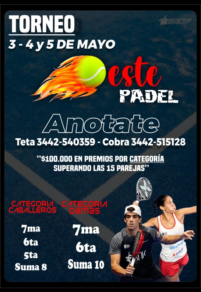 »» Evento: Torneo Oeste Padel »» Localidad: Concepción del Uruguay »» Fechas: 03/05/2024 al 05/05/2024